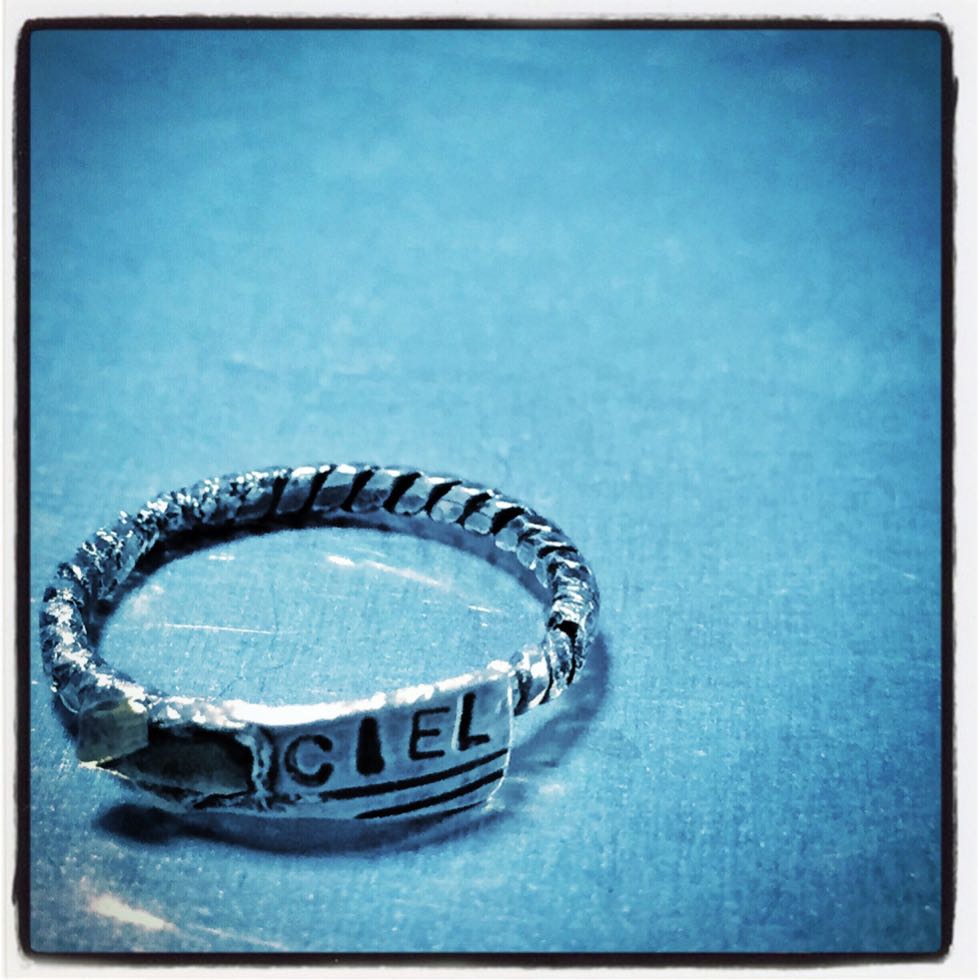 ファランジリングかピンキーリングに。刻印は空という意味の言葉。真鍮とシルバーのコンビで。